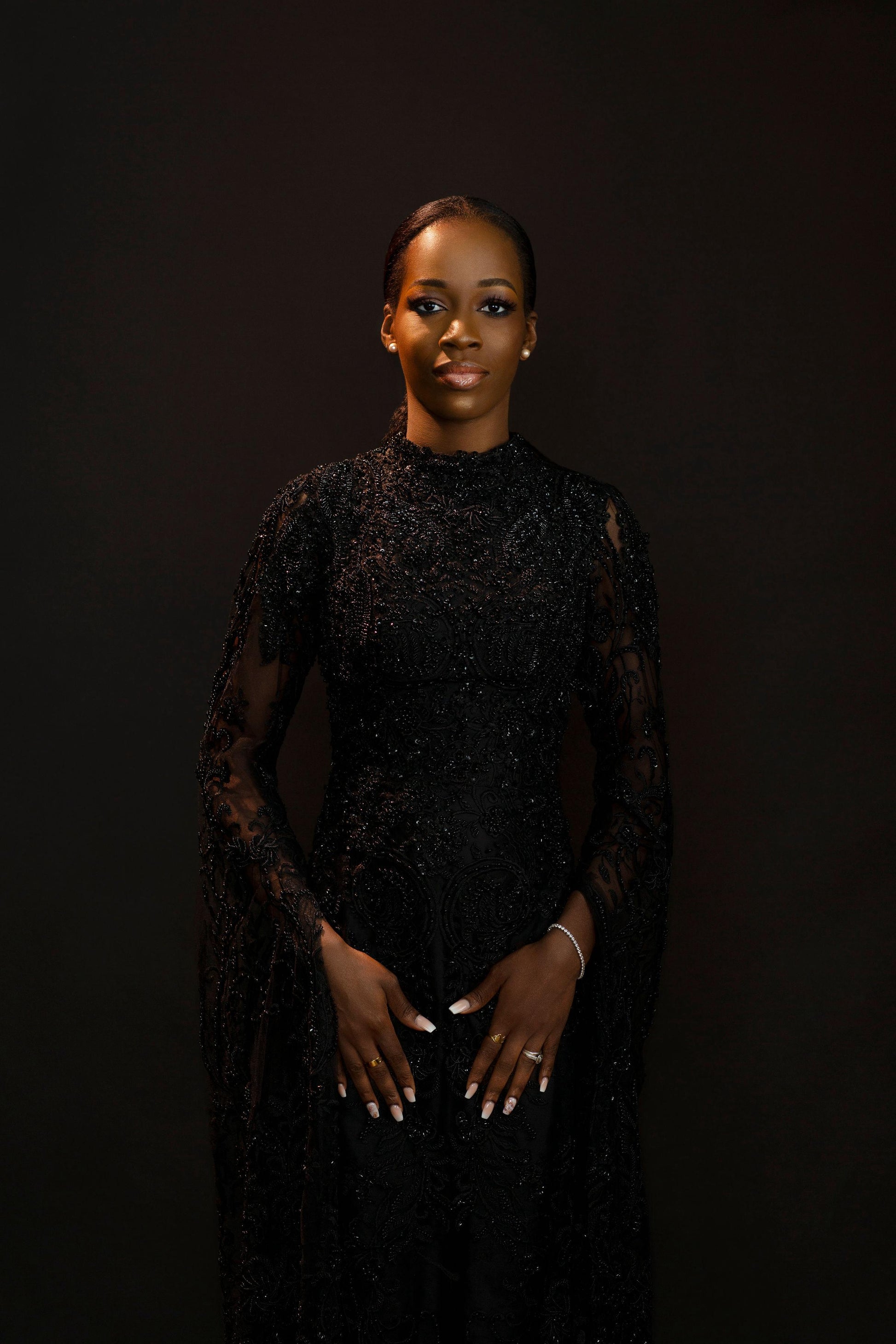 Radiate elegance with this couture black sequin maxi dress, a stunning blend of luxury and sophistication. Crafted with intricate sequin embellishments and delicate lace detailing, this floor-length gown features long sleeves and a high neckline, exuding timeless glamour. The flowing silhouette and sheer overlays add a touch of drama, making it ideal for galas, red carpet events, or upscale soirées. A limited-edition piece designed for the confident fashionista, perfect your look with this show-stopping ensemble.